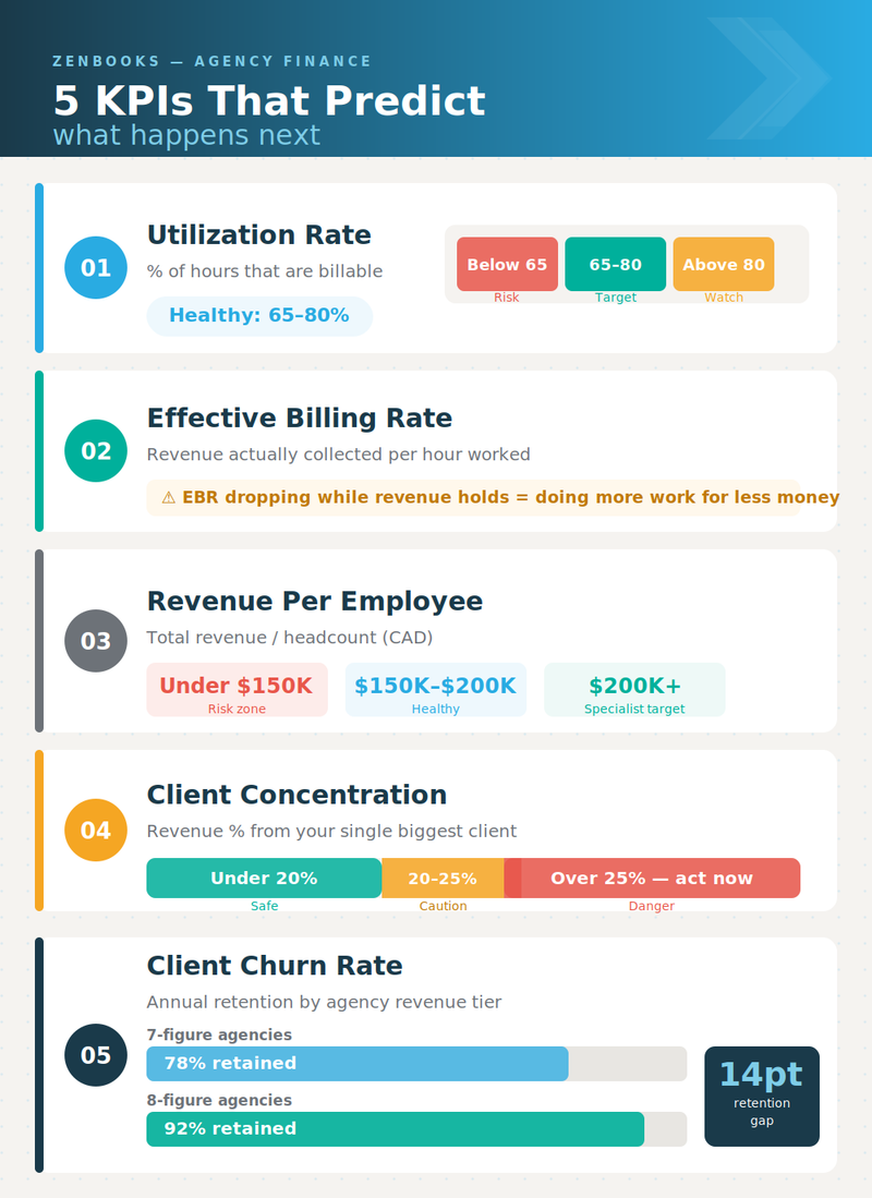 **Why it's a leading indicator:** Client concentration is not a problem until it suddenly, catastrophically is. A client who represents 35% of your revenue can leave. They can get acquired. They can bring their marketing in-house. They can simply decide to go in a different direction. When that happens, no amount of strong financials from the previous quarter helps you make payroll next month.