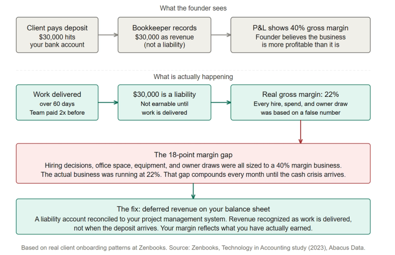We have seen agencies running at what they believed was 40% gross margin discover, after proper deferred revenue accounting is applied, that their real margin was closer to 22%. The business was not failing. But every financial decision the founder had been making, on hiring, on space, on equipment, on their own draw, was based on a number that was not real.