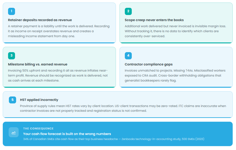 The Zenbooks research we conducted with 500 Canadian SME owners also found that managing cash flow tied with paying bills as the leading financial pain point. For agencies specifically, accurate bookkeeping is the single most important input to solving that problem. You cannot forecast what you cannot accurately measure.