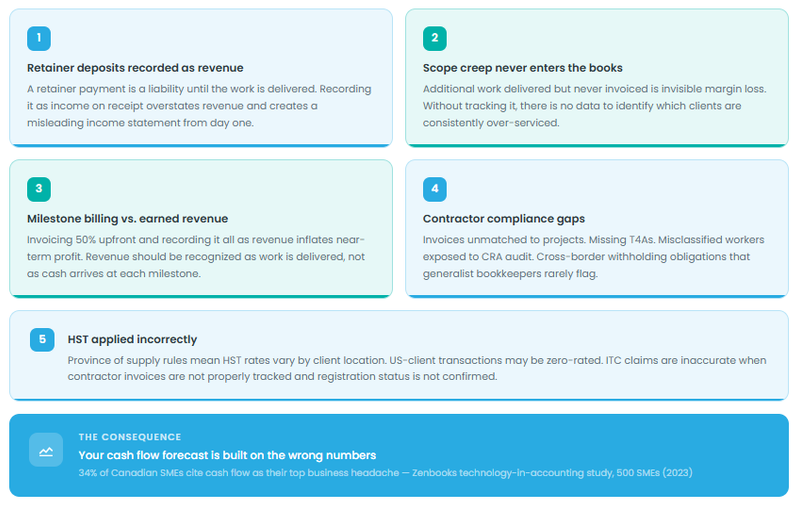 The Zenbooks research we conducted with 500 Canadian SME owners also found that managing cash flow tied with paying bills as the leading financial pain point. For agencies specifically, accurate bookkeeping is the single most important input to solving that problem. You cannot forecast what you cannot accurately measure.