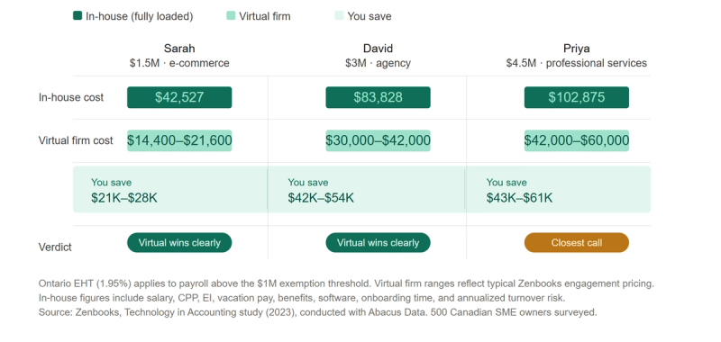 The verdict: Virtual wins clearly. At $1.5M, Sarah does not need a dedicated in-house hire. She needs accurate books, clean HST filings, and timely monthly reporting. A virtual firm delivers all of that for roughly half the fully-loaded cost of a part-time employee, with broader expertise and no management overhead. Boutique La Muse, a client Zenbooks has worked with since their early growth stage, scaled from $800K to $3.8M in revenue while outsourcing their entire accounting function. You can read that story here