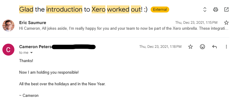 [An email from Cameron Peters, founder of TaxCycle, after Xero's acquisition was announced. Eric made the introduction.]
