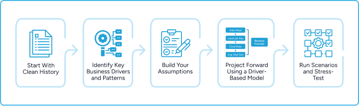 - Project Forward Using a Driver-Based Model: Instead of just adding 10% to last year's sales, build a driver-based model. For example, your revenue forecast might be a formula like: (Number of Sales Reps) x (Leads per Rep) x (Close Rate) x (Average Deal Size). This is far more powerful because you can now see how changing one driver (like improving the close rate) will impact the entire forecast.