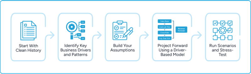 - Project Forward Using a Driver-Based Model: Instead of just adding 10% to last year's sales, build a driver-based model. For example, your revenue forecast might be a formula like: (Number of Sales Reps) x (Leads per Rep) x (Close Rate) x (Average Deal Size). This is far more powerful because you can now see how changing one driver (like improving the close rate) will impact the entire forecast.
