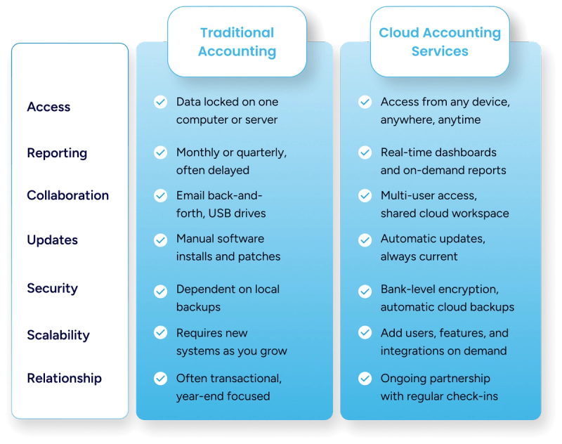 If you've worked with a traditional accounting firm before, you may be wondering what actually changes when you move to the cloud. The differences go deeper than just software.