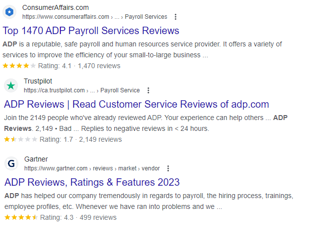 ADP has mixed user reviews, with some users praising the extensive feature set and helpful customer support, while others have criticized the complex interface and occasional billing errors. Some users have also reported difficulty cancelling services. The reviews are a bit more scattered. From Trust pilot’s 2,149 reviews rating of 1.7 to 4.1(1470 reviews) with ConsumerAffiairs and 4.3/5(499 reviews) with Gartner.
